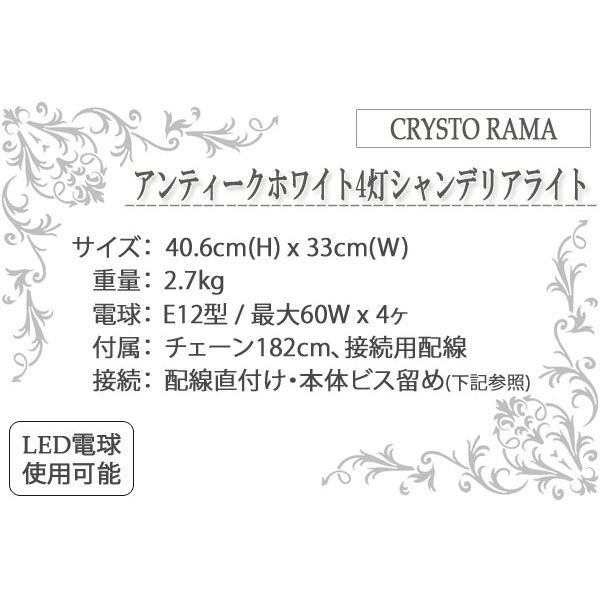 本体素材: アイアン|フィニッシュ: アンティークホワイト|取付最大寸法: 223cm(H)|取付最小寸法: 47cm(H)|重量: 2.7kg|メダリオン: 13cm(W)|チェーン: 182cm(調整可)|接続配線: 304cm|口金: E12型|電力: 最大60W x 4|広さの目安: 8畳