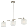 本体素材: アイアン&スチールメタル|フィニッシュ: ポリッシュドニッケル|シェード: エッヂドガラス|取付最大: 132cm(H)|取付最小: 39cm(H)|重量: 4.9kg|メダリオン: 2.5cm(H) x 12cm(W)|接続配線: 182cm|口金: E26型|電力: 最大100W x 3|広さの目安: 10畳